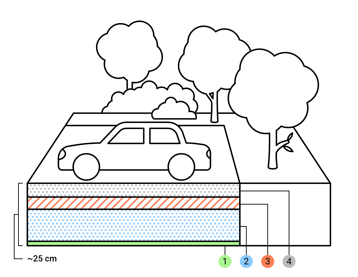 Ajotien pitää kestää kulutusta ja liikennettä painumatta. Se rakennetaan pihalle kuten tavallinen tie. Eri materiaalit, vahvistuskerros, kantava kerros ja kulutuskerros jakavat yhdessä painon siten, että ajotie ei painu tai vaurioidu.