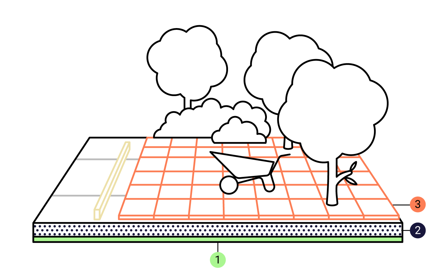 Kantavakerros. Aseta suodatinkangas alimmaiseksi maan ja murskeen väliin, jotta ne eivät sekoitu. Huomioi, että talosta poispäin viettävä kaltevuus on vähintään 2 %, jotta vedenpoisto toimii. Lisää tasainen kerros kalliomursketta 0/32 vähintään 10 cm suodatinkankaan päälle.